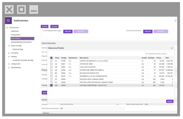 Puede gestionar partidas de un presupuesto de obras, seleccionandolalas para definir la cantidad del subcontratos