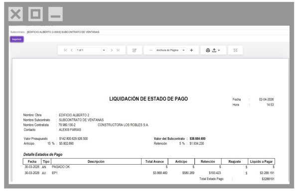 Exporta un informe de liquidación de estados de pago, permitiendo conocer los avances por cantidad y porcentaje de actividad